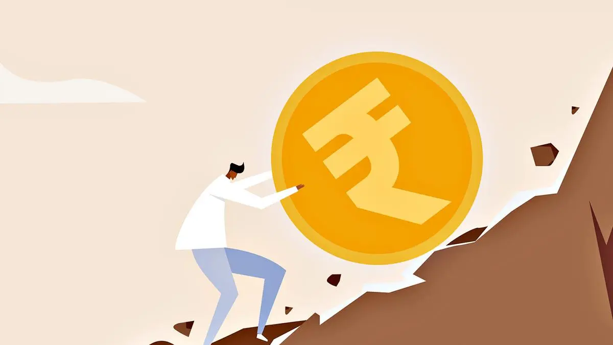 An man trying hard to push the Rupee coin uphill