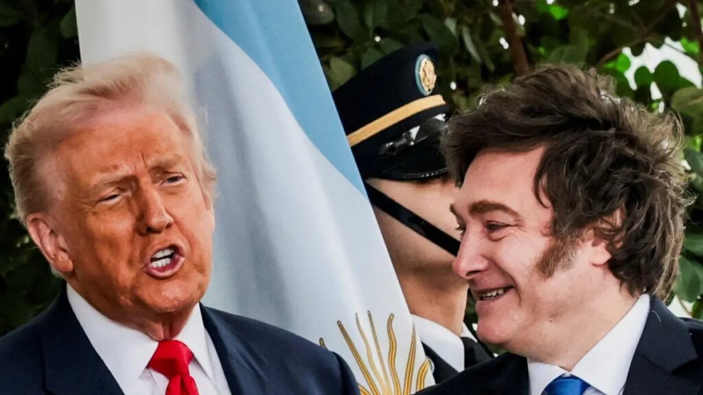 U.S. President Donald Trump reacts as he welcomes Argentina’s President Javier Milei at the White House in Washington, D.C., U.S., October 14, 2025.