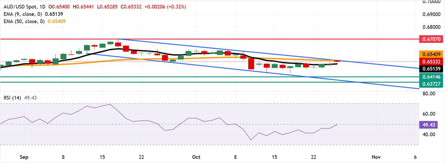 AUD/USD is trading around 0.6530 on Monday. Technical analysis of a daily chart suggests a potential for weakening of a bearish bias, with the pair positioned near the upper boundary of the descending channel. The pair is trading above the nine-day Exponential Moving Average (EMA), suggesting the short-term price momentum is stronger.