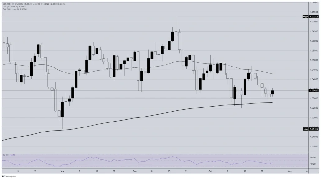 GBP/USD continues to trade under pressure, holding below the 50-day EMA at 1.3428 while finding near-term support around the 200-day EMA at 1.3278. The pair has shown limited follow-through after a small rebound from last week’s 1.3250 low, keeping the broader downtrend intact.