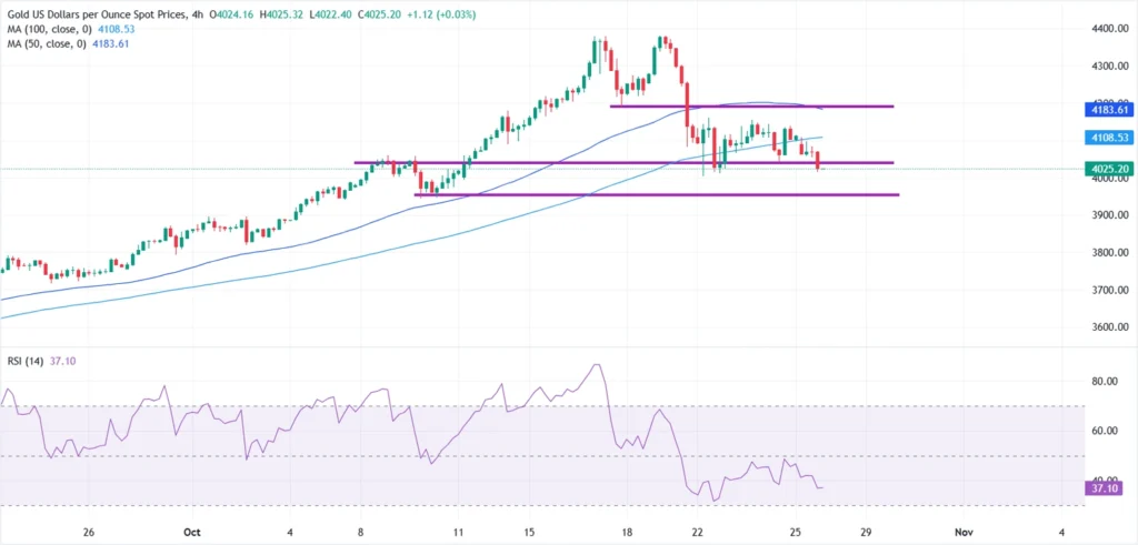Gold (XAU/USD) kicks off the week with a negative tone, as improved risk appetite curbed demand for safe-haven assets. At the time of writing, XAU/USD is trading around $4,025, down over 2.0%, extending its retreat from last week’s record high of $4,381 after a wave of profit-taking spurred by progress in trade talks.