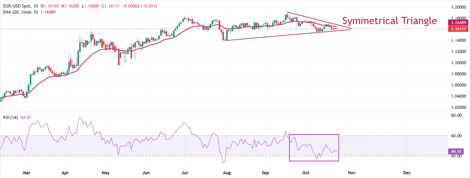 EUR/USD trades in a tight range slightly above 1.1600 during the late European trading session on Friday. The major currency pair demonstrates a broader sideways trend amid a Symmetrical Triangle chart pattern formation.